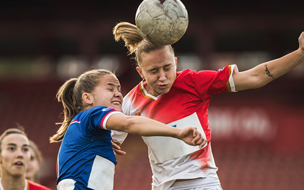 A young female athlete heads a soccer ball during a game.