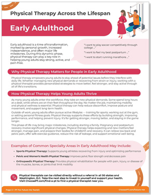 Physical therapy empowers young adults to stay ahead of potential issues before they interfere with daily life. Whether managing new physical demands or recovering from strain or injury, working with a physical therapist provides personalized strategies to move better, feel stronger, and stay active through all of life’s transitions.