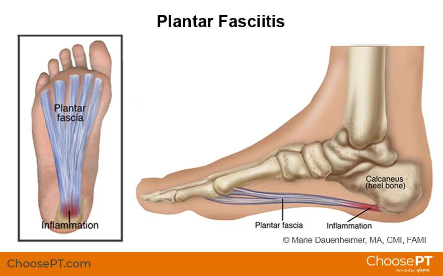 Plantar fasciitis is a condition causing foot pain. The plantar fascia is a thick band of tissue that supports the arch of your foot. It connects the heel to the ball of the foot. This band can become inflamed or can tear, causing pain. Pain can be felt in the heel, along the arch, or at the ball of the foot. Plantar fasciitis is a common foot condition. It occurs in as many as 2 million Americans per year and 10% of the population over their lifetimes. Plantar fasciitis affects people of all ages, both athletes and nonathletes. Men and women have an equal chance of developing the condition. Physical therapists help people experiencing plantar fasciitis reduce their pain and restore their walking ability.