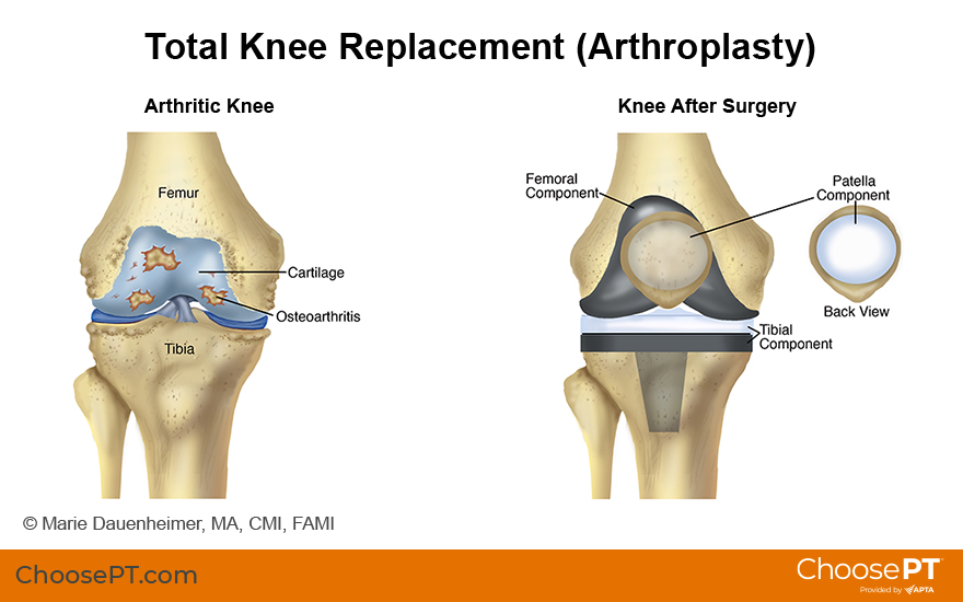 A total knee replacement, or arthroplasty, involves replacing damaged parts of the bones at the knee joint. The knee is the most replaced joint in the body. It is best to consult both your surgeon and physical therapist when deciding whether to have a total knee replacement. Your decision should be based on how much your pain or loss of function is affecting your quality of life. Usually, people have total knee replacement surgery after trying conservative treatment options for: