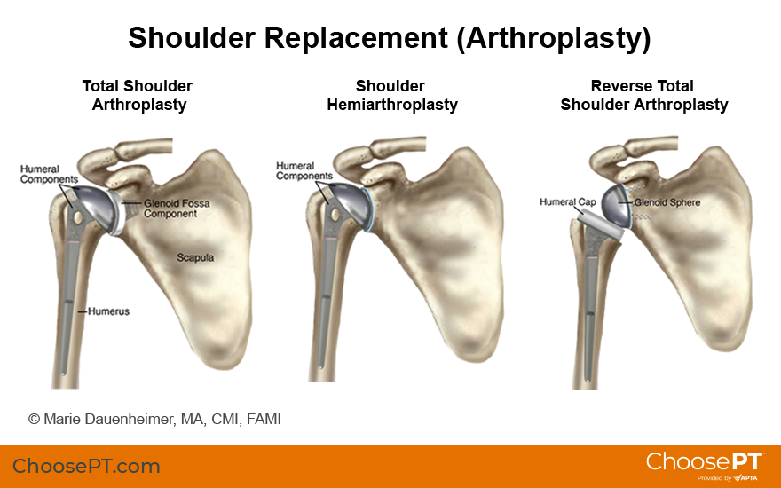Shoulder replacement (arthroplasty) is surgery to replace all or part of the shoulder joint. Although less common than a knee or hip replacement, around 65,000 people have shoulder arthroplasties in the U.S. each year. Physical therapists help people return to their prior activity levels after total or partial shoulder replacement surgery.